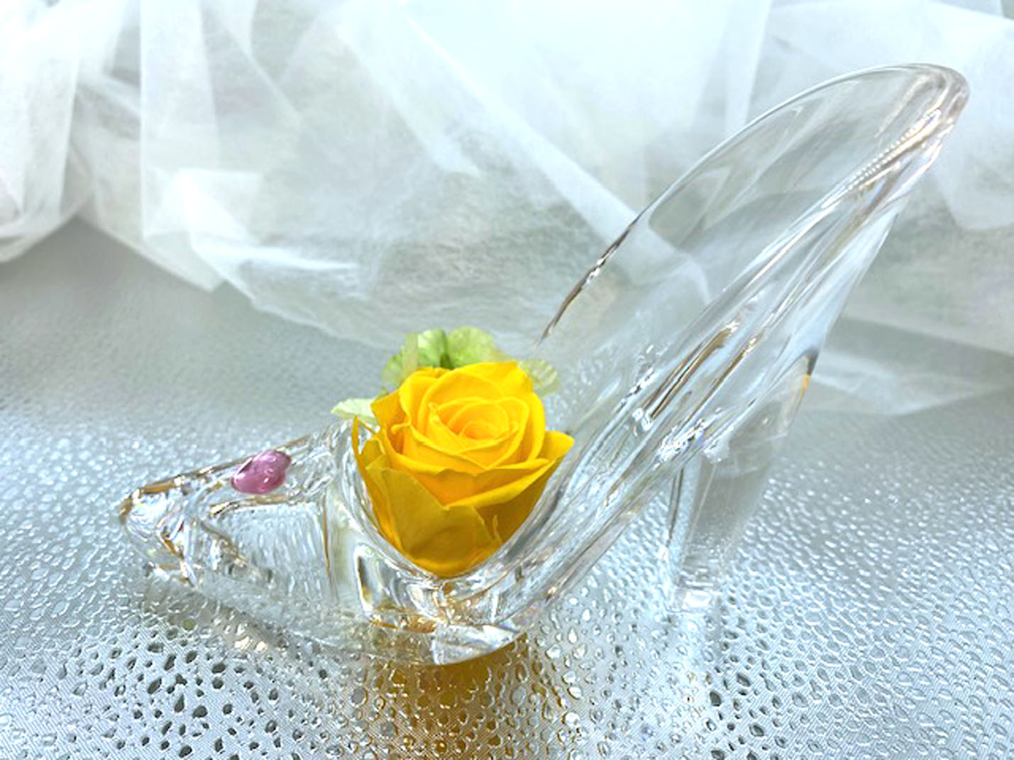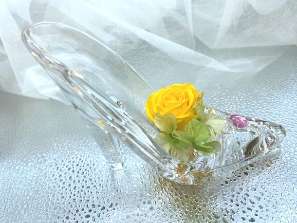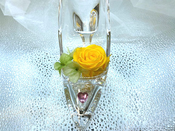 | 商品 説明 | 〇女性の憧れと希望のシンデレラストーリー。そのシンデレラが置き忘れたガラスのハイヒールに元気カラーの イエローバラをアレンジ。眺める度に明るく元気と勇気をもらえるおとぎの国のシンデレラ になったような幸せいっぱいの気分になります。(イエローバラ花言葉:友情、平和、患者) 〇清楚なクリアケース入りで、汚れや埃から長期間瑞々しさを保ちます 〇お誕生日プレゼント、結婚祝い、記念日、快気祝など色々のお祝い、ご贈答にとてもお喜びいただけます 〇ご用途に応じたラッピングしてお届けします(ラッピング料無料) 〇バラのお色が、他に赤又は紫がありますのでご希望の方は「買い物かご」の中の「ショップへのメッセージ」に ご希望のお色を書き込み下さい |