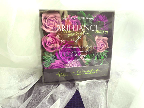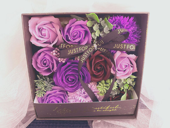 (ギフトボックスアレンジメント紫) 濃淡のパープルとバイオレットのバラをメーンに紫系のお花をギフトボックスにアレンジ。 紫色でまとめたお花は高貴で上品な落ち着いた大人の雰囲気です。 珍しい深い濃淡の紫カラーが、思わず息を止めて見入ってしまうほど神秘的で魅力的です。 また、紫は魔除けや厄払いの効果もあると言われており、古希や喜寿などのご長寿のお祝いにも贈られております。 お誕生日やお祝い、プレゼント・ギフトにオススメです。 サイズ:横約17cm×縦約17cm 高さ約8p |